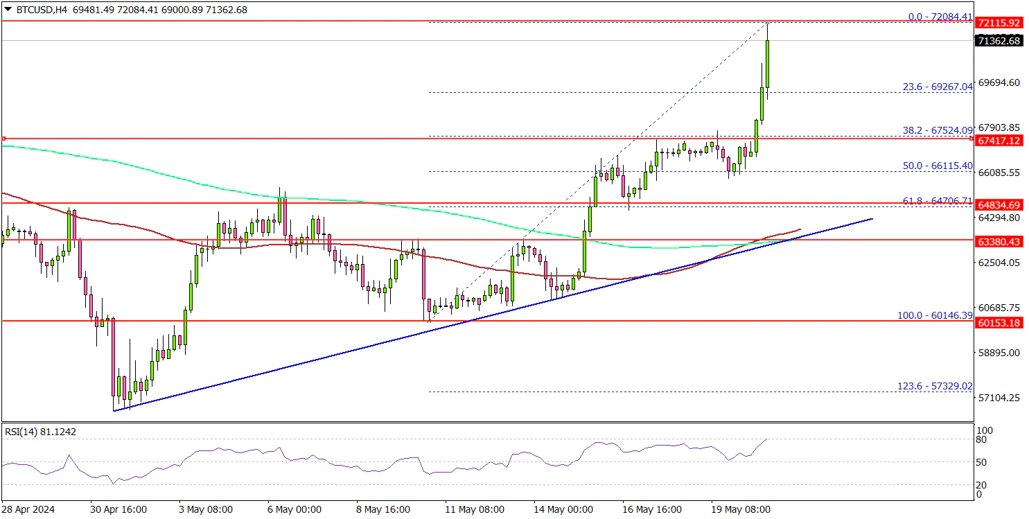 Looking at the 4-hour chart, the price settled well above the 100 simple moving average (red, 4 hours) and the 200 simple moving average (green, 4 hours). The price also surpassed $70,000 and traded as high as $72,084.