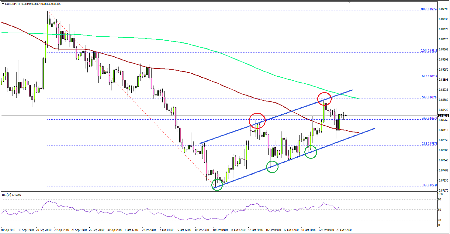 - There is a major ascending channel formed with support at 0.8800 on the 4-hours chart of EUR/GBP.