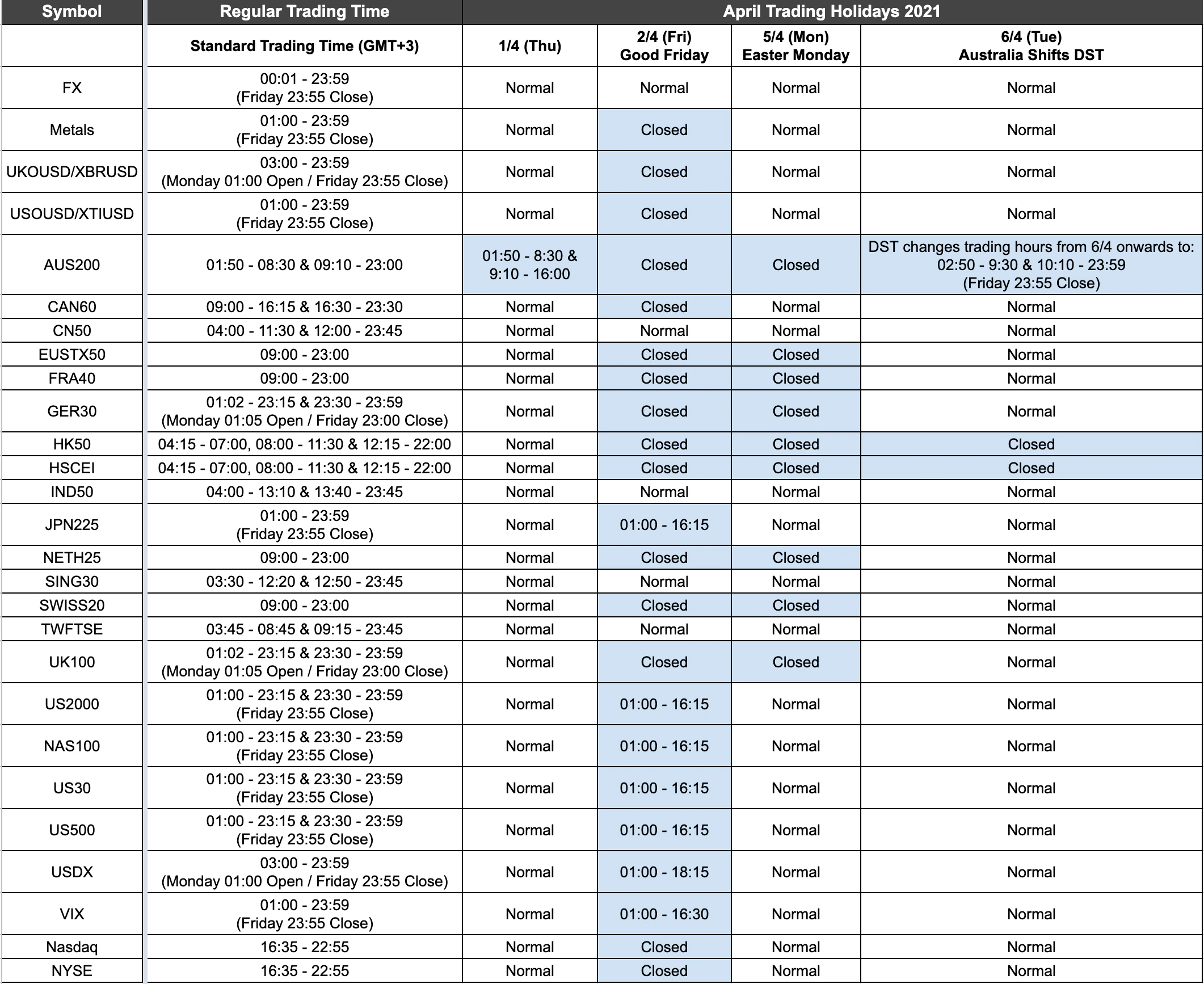 Please click on the image to zoom in.Unless indicated above the markets will be open as usual. Times shown are in GMT+3 server time.