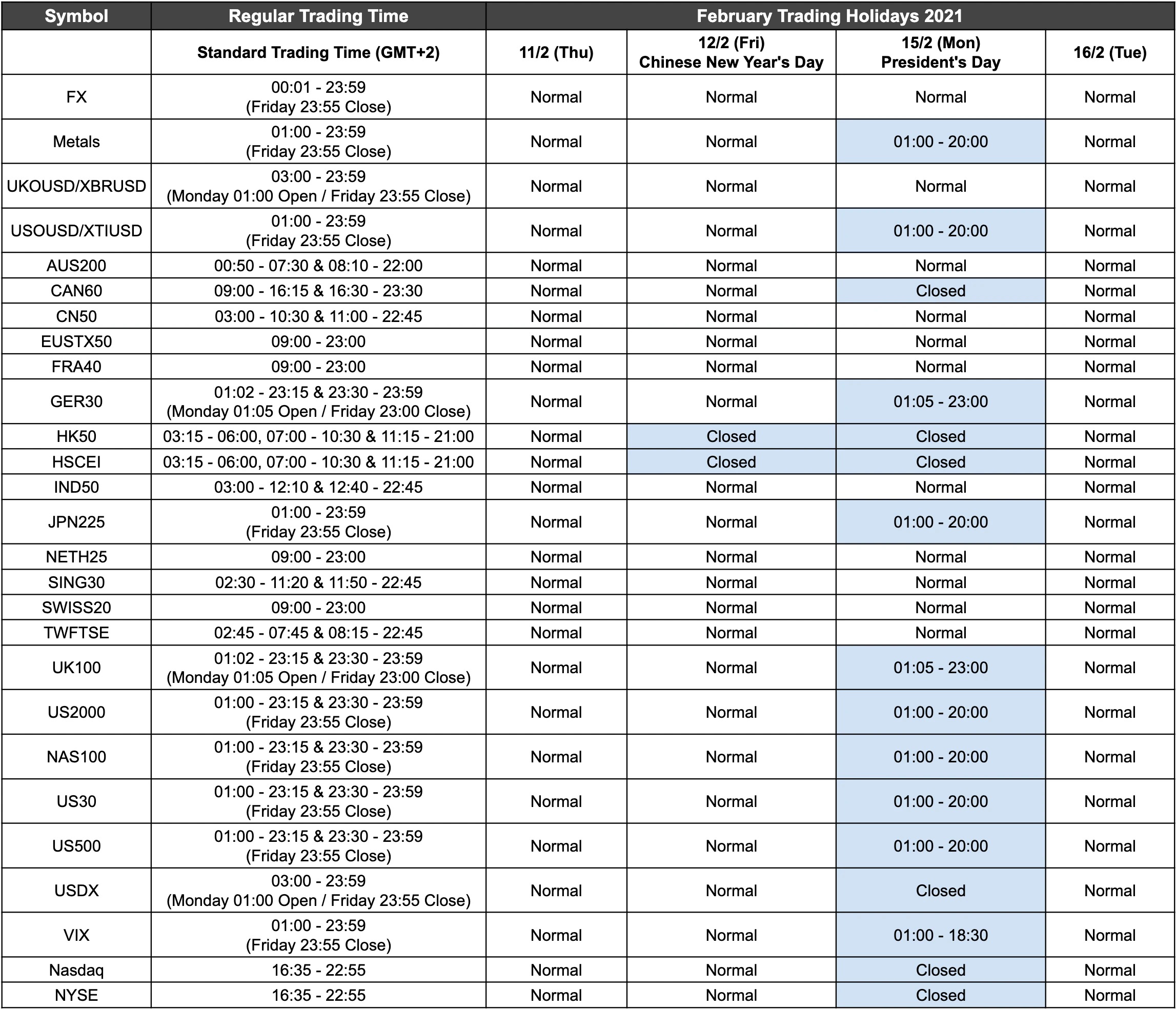 Due to global holidays in February, market hours for a number of products will be temporarily influenced on the 12th and 15th of February. Please review the table below for full details of changes to these trading hours.