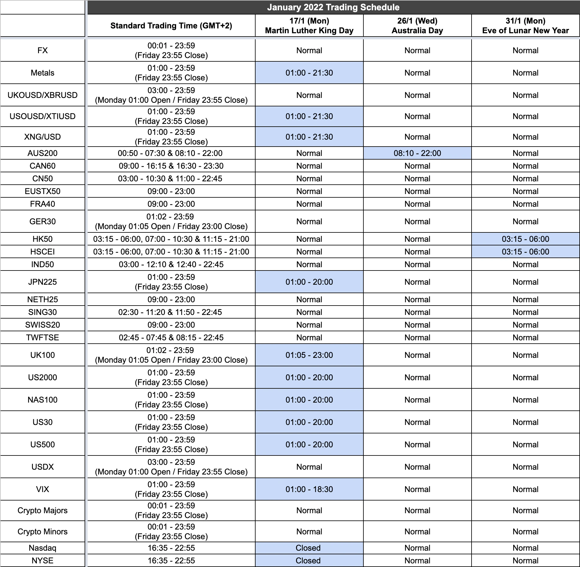 Please click on the image to zoom in.Unless indicated above the markets will be open as usual. Times shown are in GMT+2 server time.
