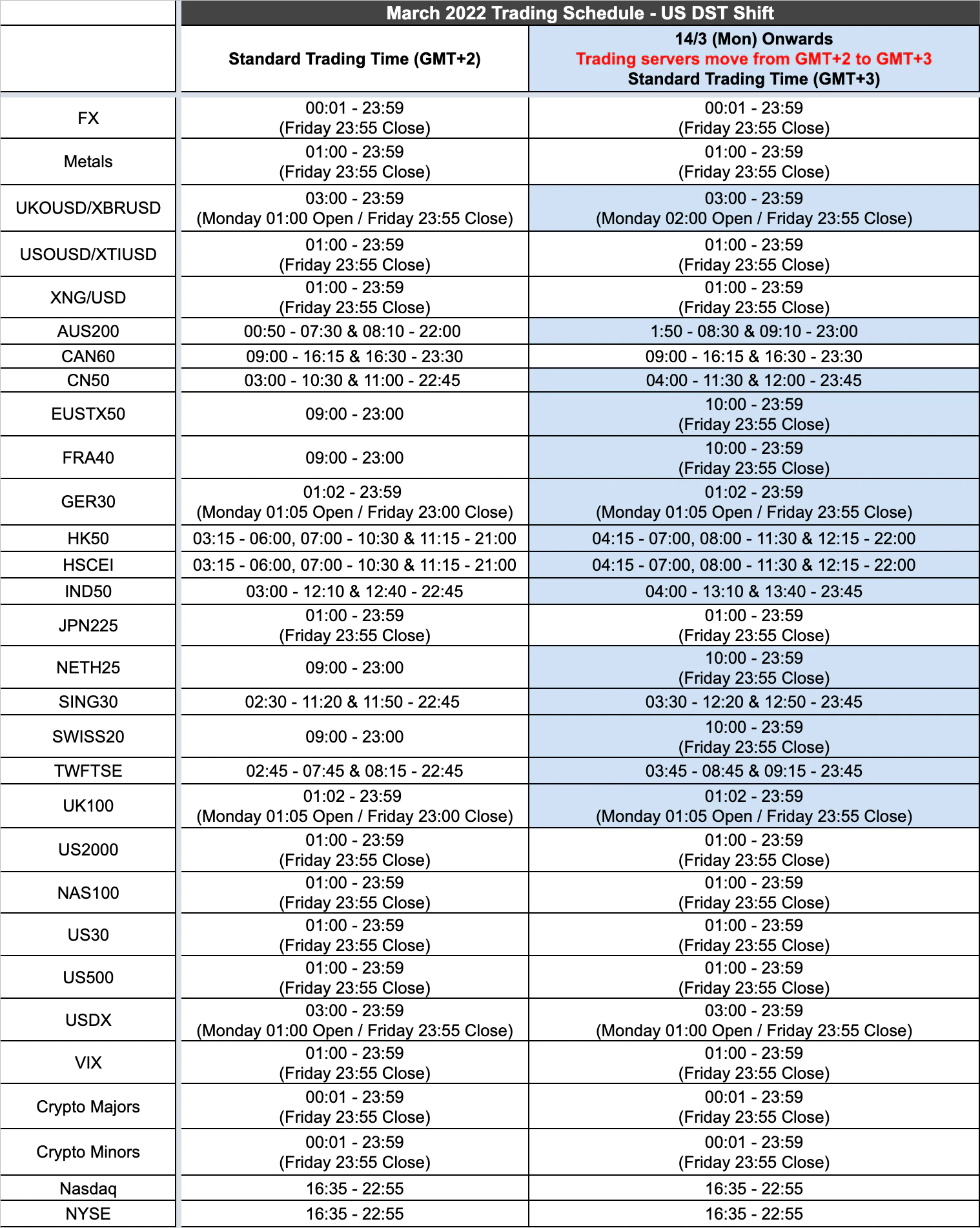 On the 14th March US DST movements shift the timezone of our MT4/MT5 trading servers from GMT+2 to GMT+3. The trading hours for some products will also change.