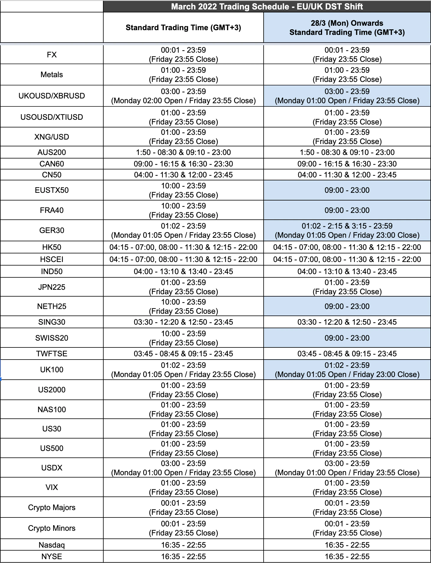 Due to Daylight Savings Time (DST) changes around the world the market hours for a number of products will be altered this month.