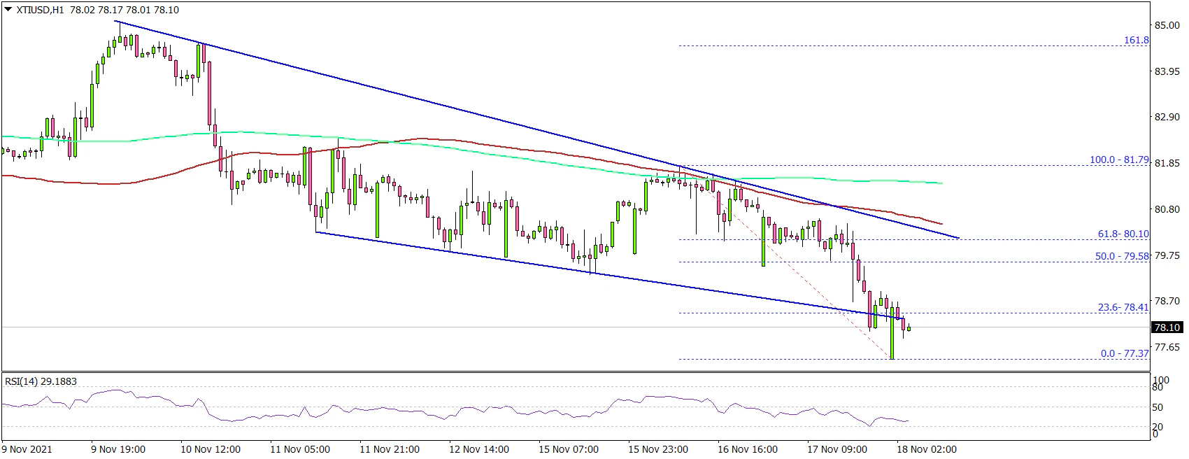 • A major bearish trend line is forming with resistance near $80.50 on the 4-hours chart of XTI/USD.