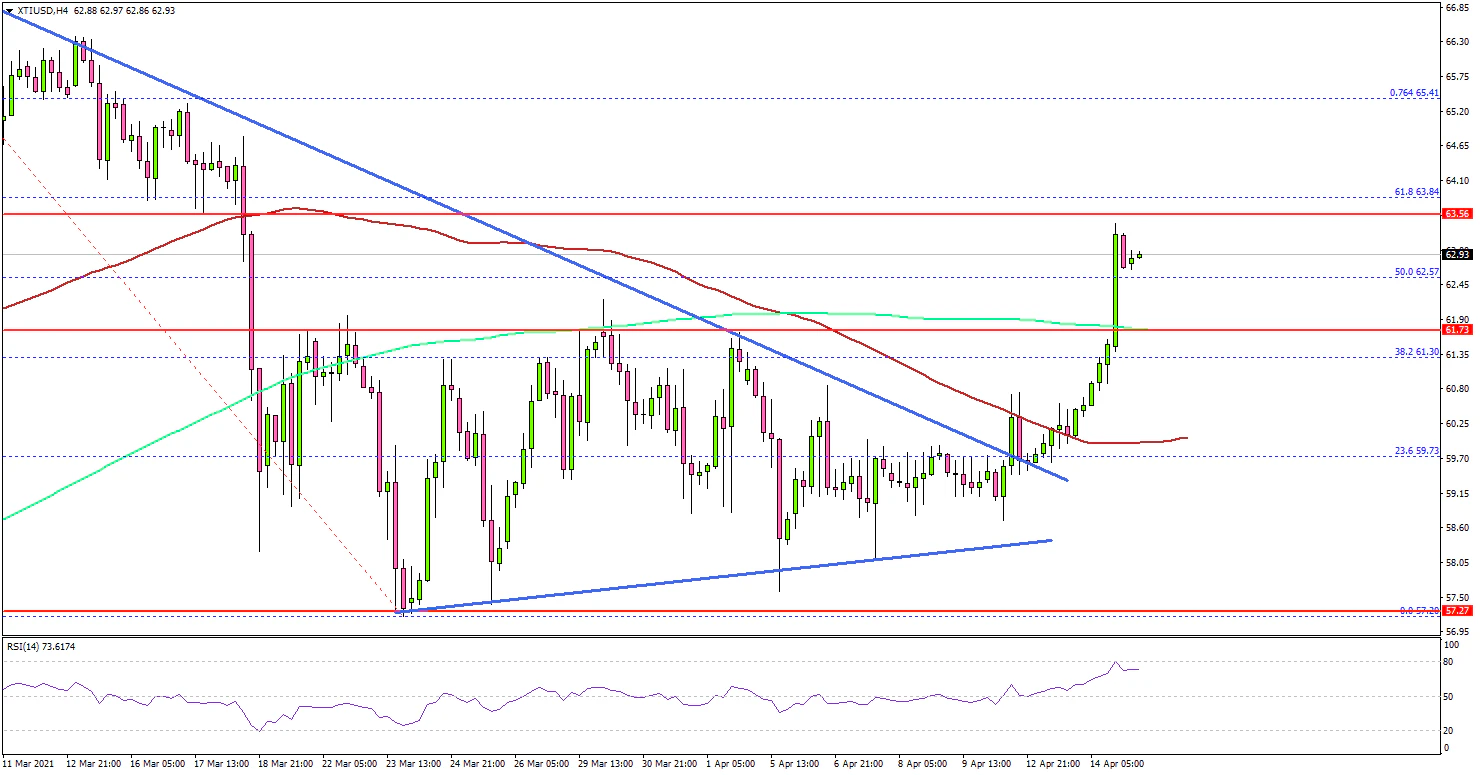 Looking at the 4-hours chart of XTI/USD, the price gained pace after it broke the $60.00 level and the 100 simple moving average (red, 4-hours). There was also a break above a major contracting triangle with resistance near $59.70.