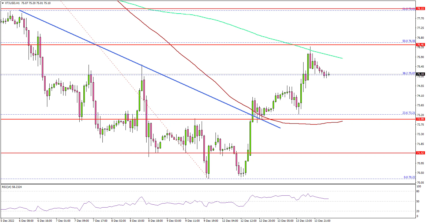 Looking at the 4-hours chart of XTI/USD, there was a break above a major bearish trend line with resistance near $73.20. There was a clear move above the 23.6% Fib retracement level of the main decline from the $82.91 swing high to $70.22 low.