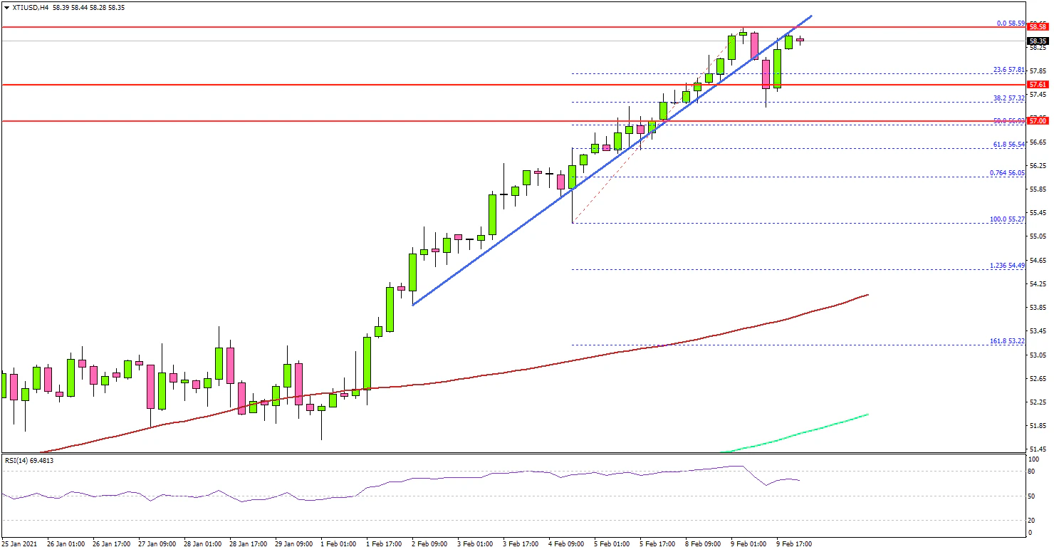 In the past few days, crude oil price saw a strong increase above the $55.00 support against the US Dollar. The price even traded to a new multi-month high at $58.59 before correcting lower.
