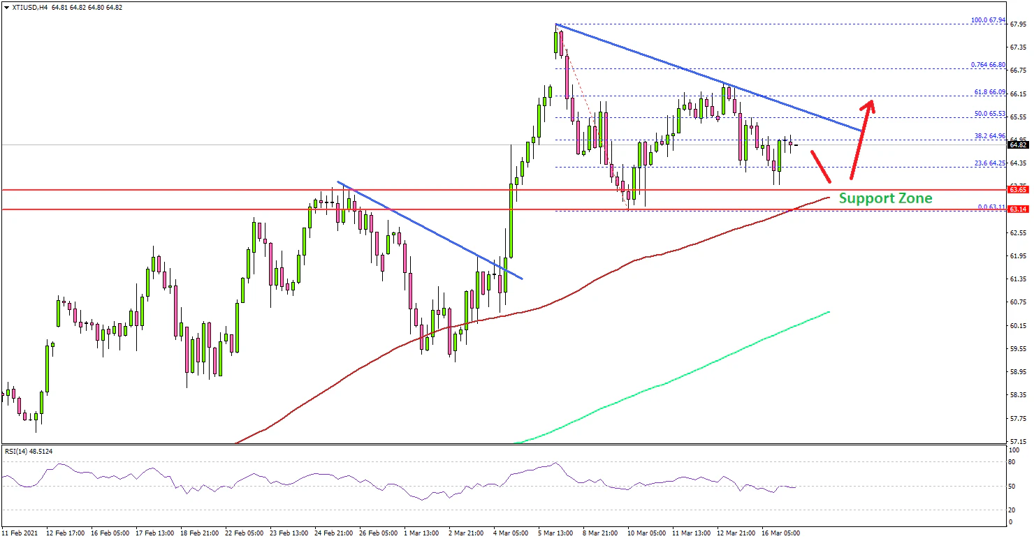 Recently, there was a downside correction below the $66.00 and $65.00 levels. The price found support near $63.20 and it started a fresh increase. It climbed above $65.50, but the bulls struggled above $66.00.
