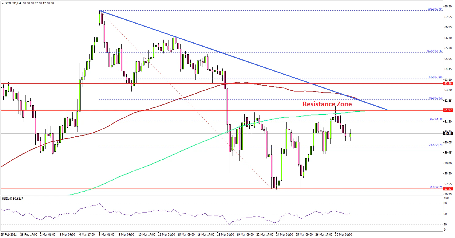 • A crucial bearish trend line is forming with resistance near $62.60 on the 4-hours chart of XTI/USD.
