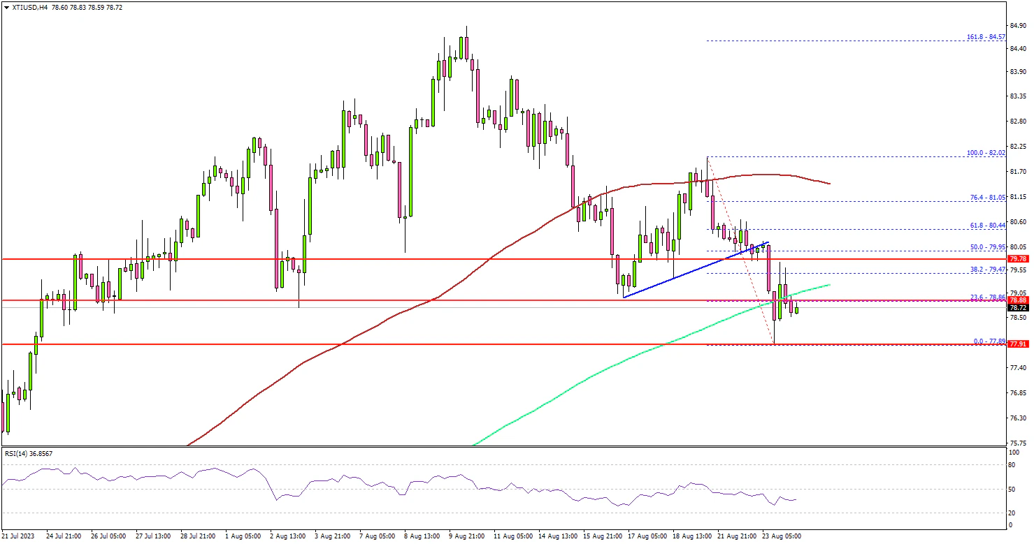 It even tested the $77.80 zone. A low was formed near $77.89 before the price started a recovery wave. It retested the $79.00 resistance zone and the 23.6% Fib retracement level of the downward move from the $82.02 swing high to the $77.89 low.