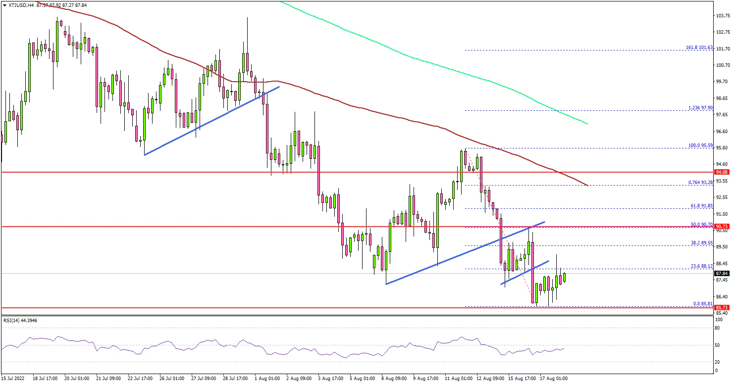 Conversely, the price might resume its decline below the $86.00 level. The next major support is near $85.50. The main support sits near $83.20, below which there is a risk of a move towards the $80.00 level. Any more losses might call for a test of the $78 zone.