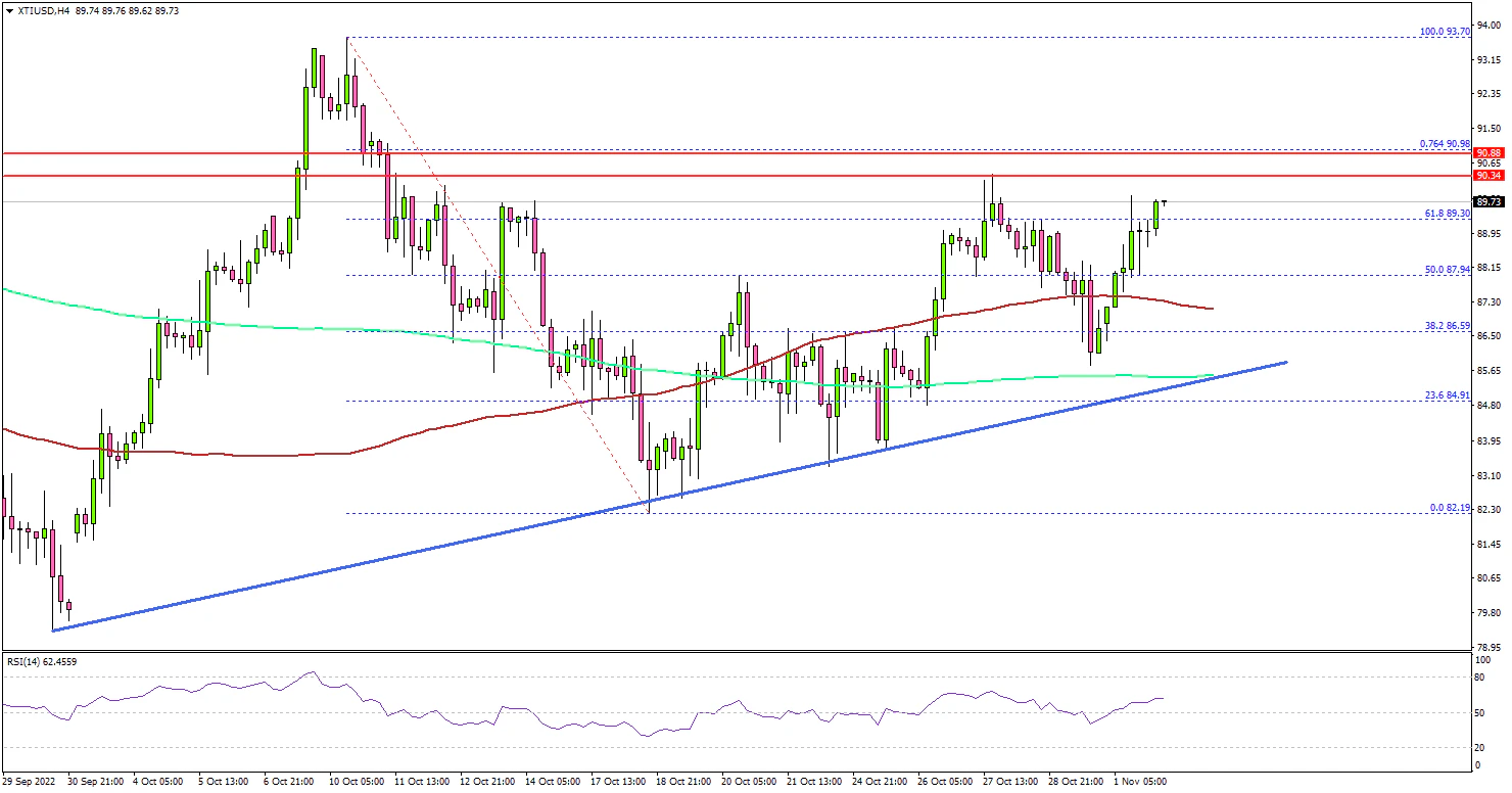- Crude oil price started a fresh increase above the $86.50 and $87.20 resistance levels.