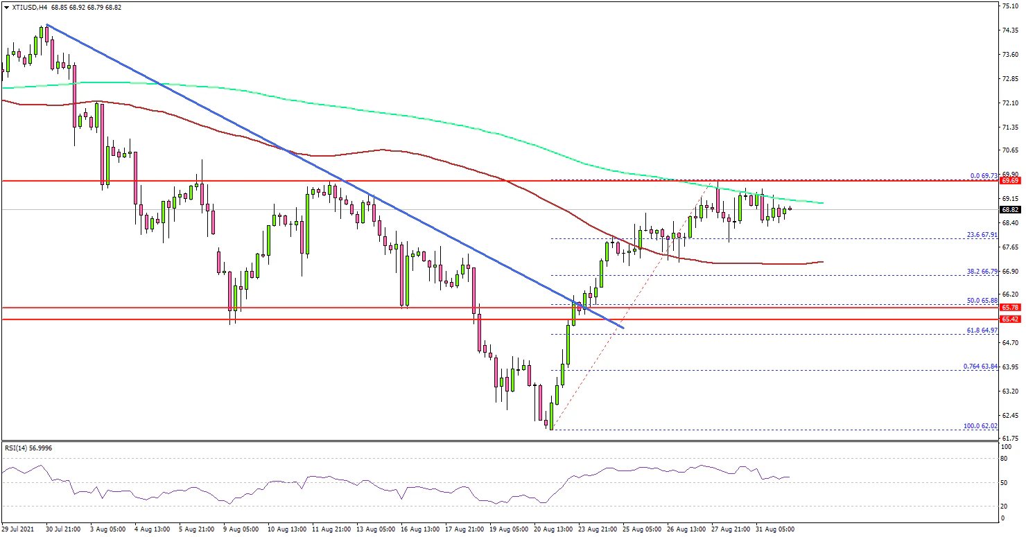 The price climbed above the $68.00 level and the 100 simple moving average (4-hours, red). However, it is now facing a strong resistance near the $69.75 level and the 200 simple moving average (4-hours, green).