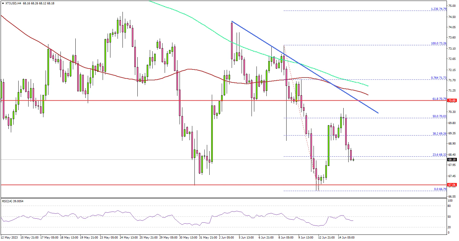 Looking at the 4-hour chart of XTI/USD, the price even cleared the $68.80 resistance but stayed below the 100 simple moving average (red, 4-hour) and the 200 simple moving average (green, 4-hour).