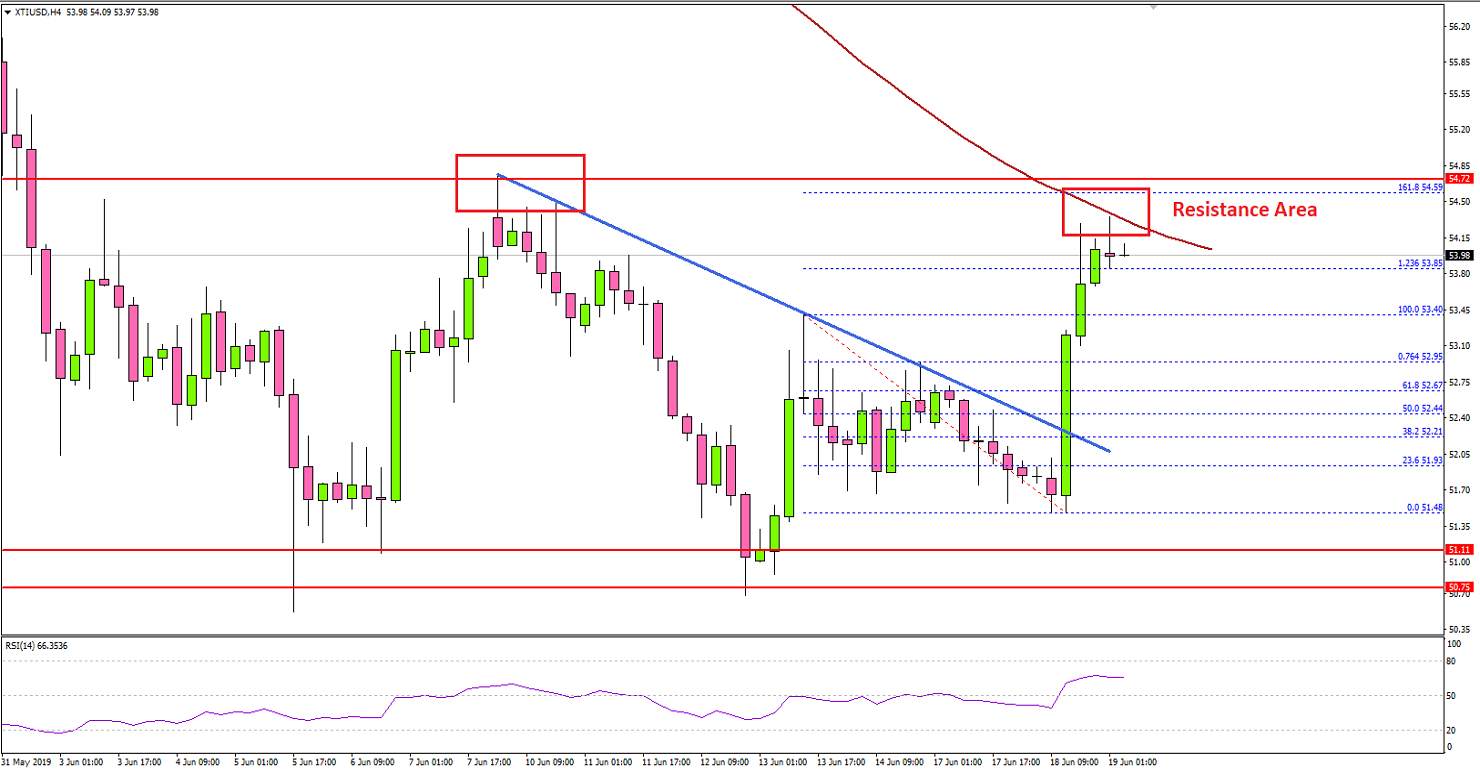 It opened the doors for more gains above the $53.40 level. Thebulls successfully cleared the $53.80 resistance level and the 1.236 Fibextension level of the decline from the $53.40 high to $51.48 low.
