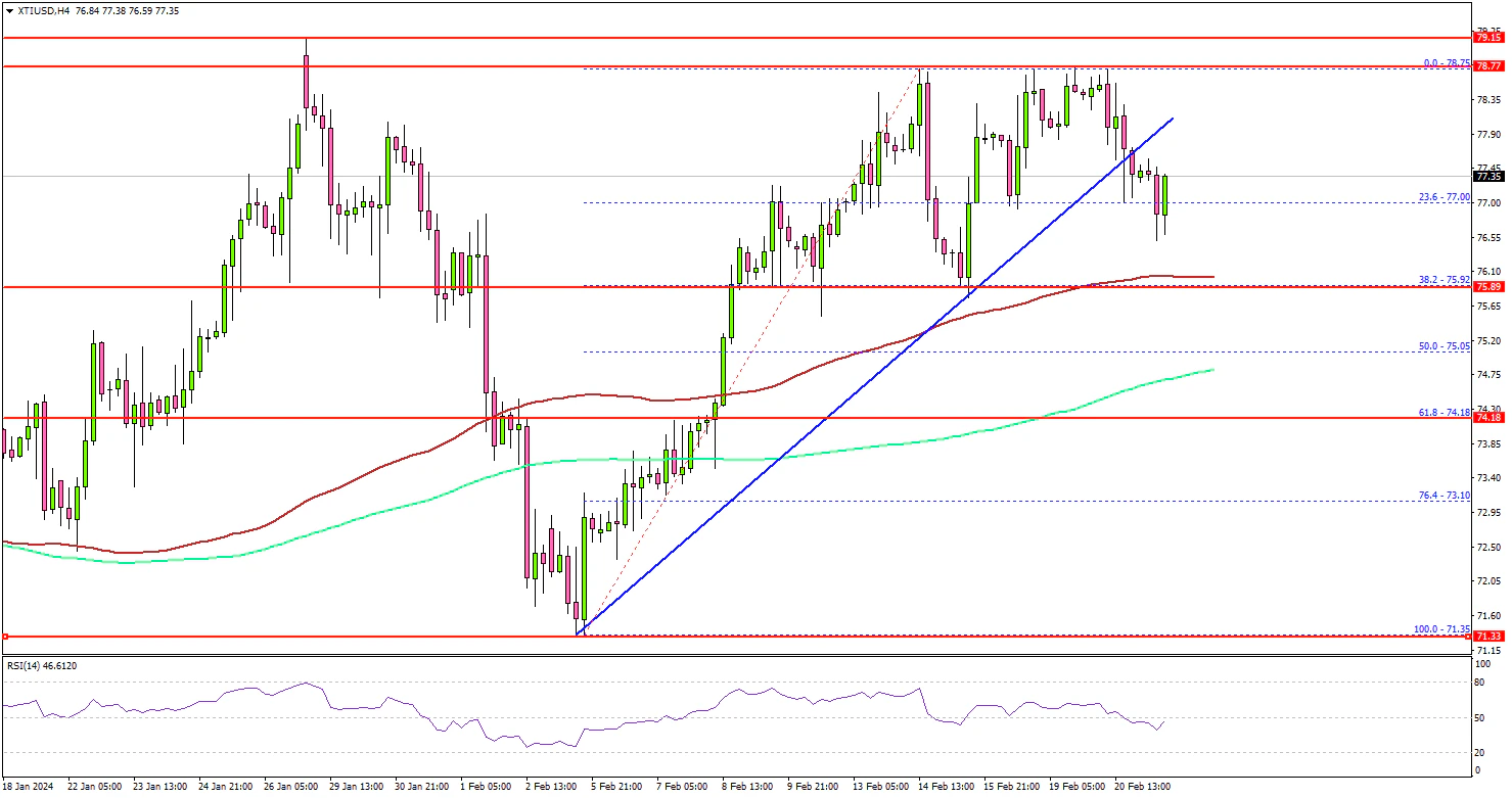 The 38.2% Fib retracement level of the upward move from the $71.35 swing low to the $78.75 high is also near the $76.00 zone. The next major support is at $74.20, below which the price might test $73.10. Any more losses might send oil prices toward $71.80.