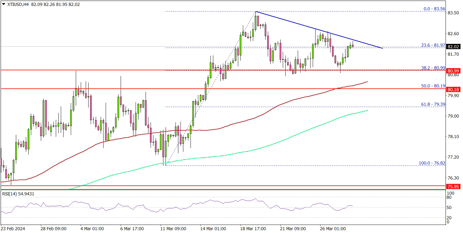 However, the bulls are active near the $81.00 zone and the 100 simple moving average (red, 4-hour). On the upside, the price is facing hurdles near the $82.50 level.