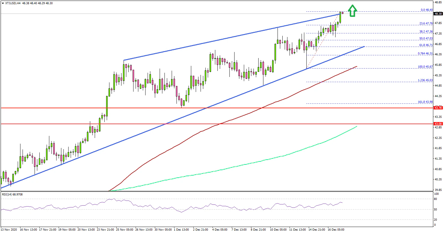 Looking at the 4-hours chart of XTI/USD, the price gained pace above the $47.00 and $47.20 resistance levels. A new multi-month high is formed near $48.40 and it seems like the price might continue to rise.