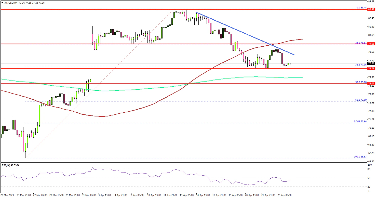 - A key bearish trend line is forming with resistance near $78.60 on the 4-hour chart.