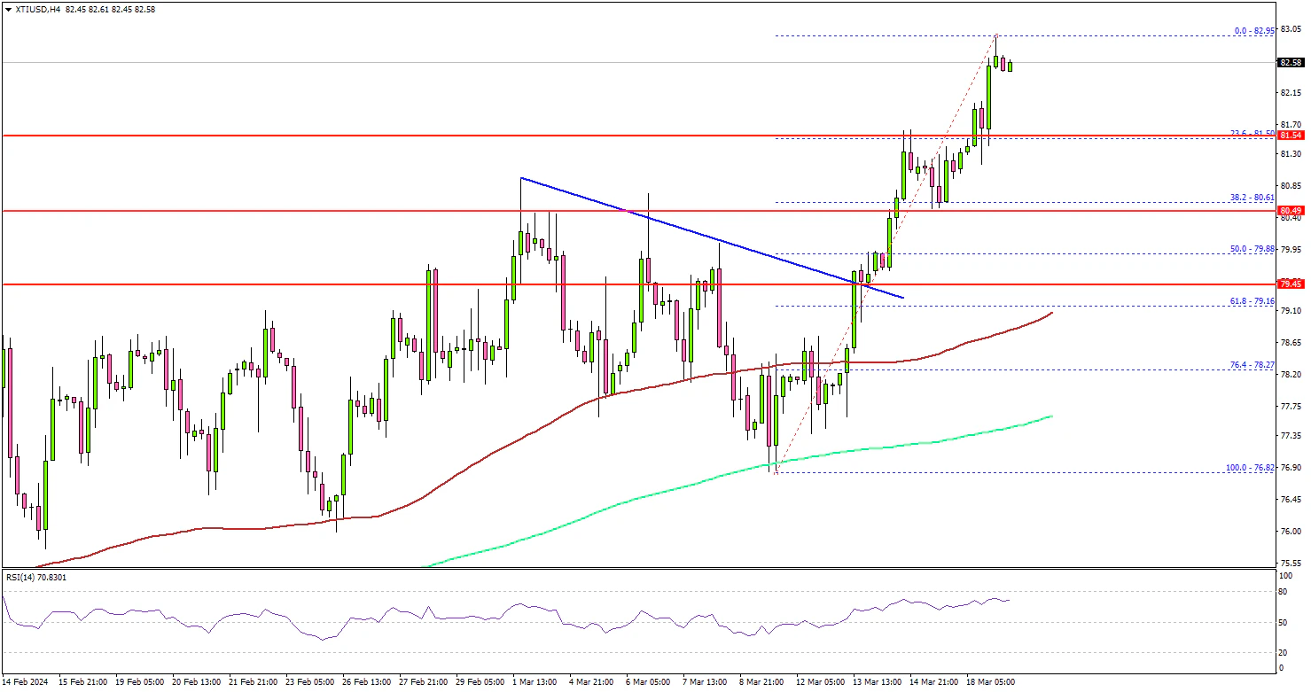 On the upside, the price is facing hurdles near the $82.80 level. The next major resistance is near the $83.00 zone, above which the price may perhaps accelerate higher. In the stated case, it could even visit the $85.00 resistance.