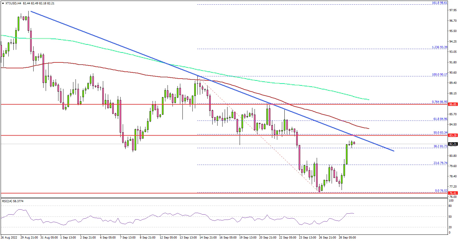 - A major bearish trend line is forming with resistance at $82.20 on the 4-hours chart.