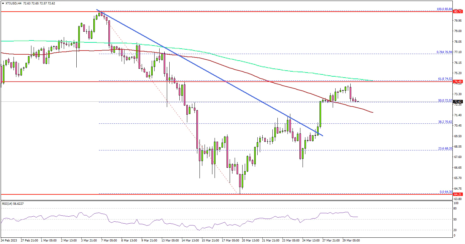 On the upside, the price is facing resistance near the $74.50 zone. It is near the 61.8% Fib retracement level of the downward move from the $80.84 swing high to $64.0 low.