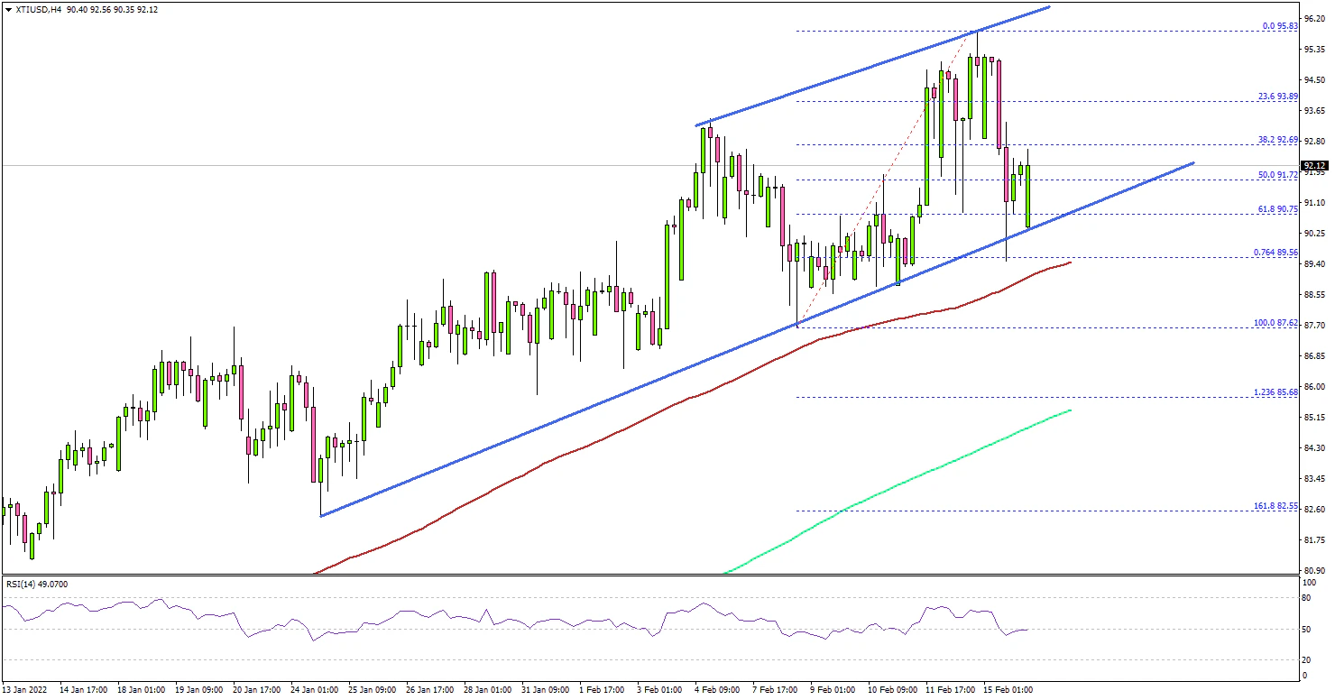 • A major bullish trend line is forming with support near $91.50 on the 4-hours chart of XTI/USD.