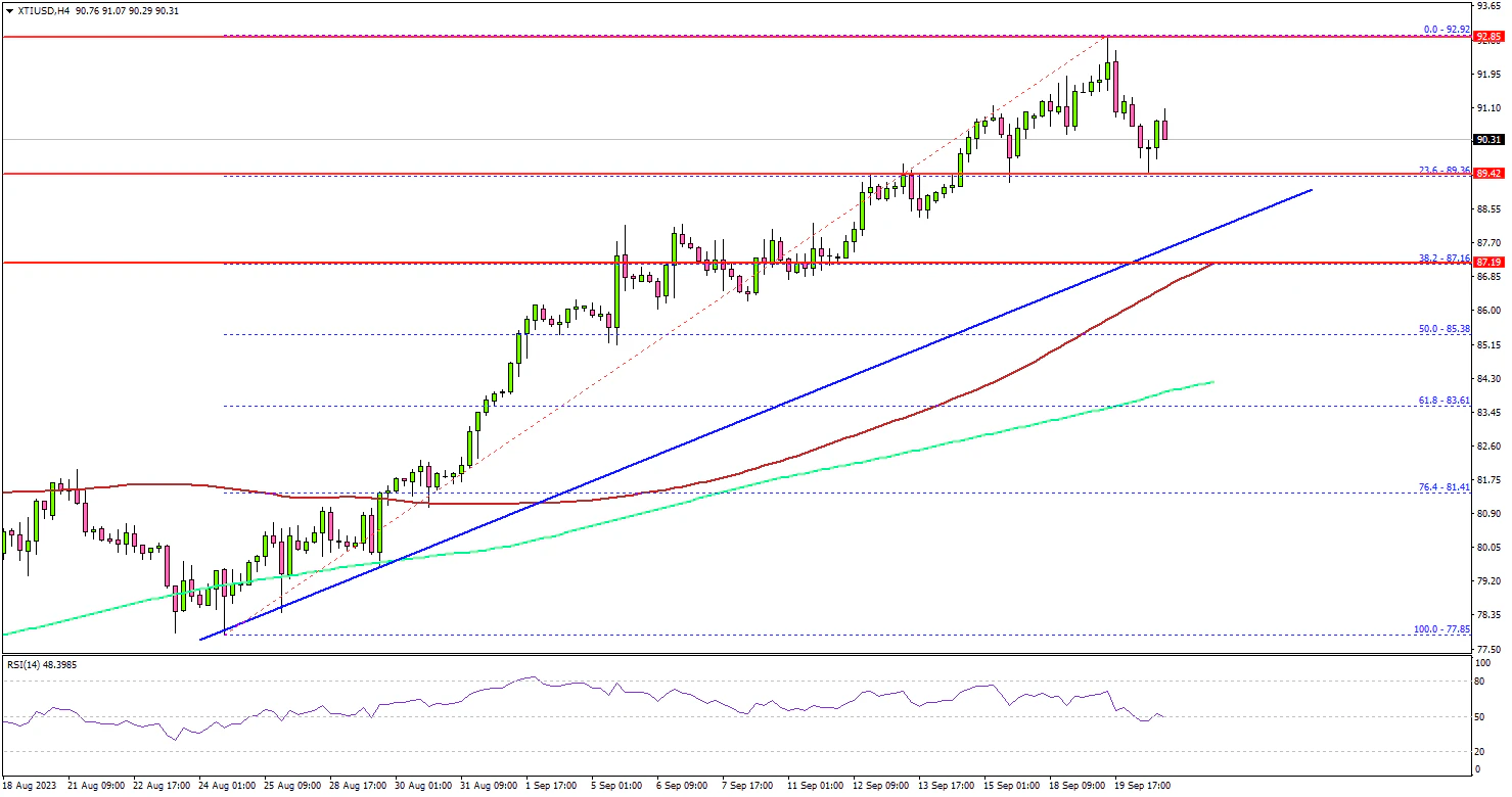 Finally, it traded to a new multi-week high at $92.92. Recently, there was a minor downside correction below the $91.20 level. However, the bulls seem to be active above the $89.40 level. The 23.6% Fib retracement level of the upward move from the $77.85 swing low to the $92.92 high is also near $89.40.