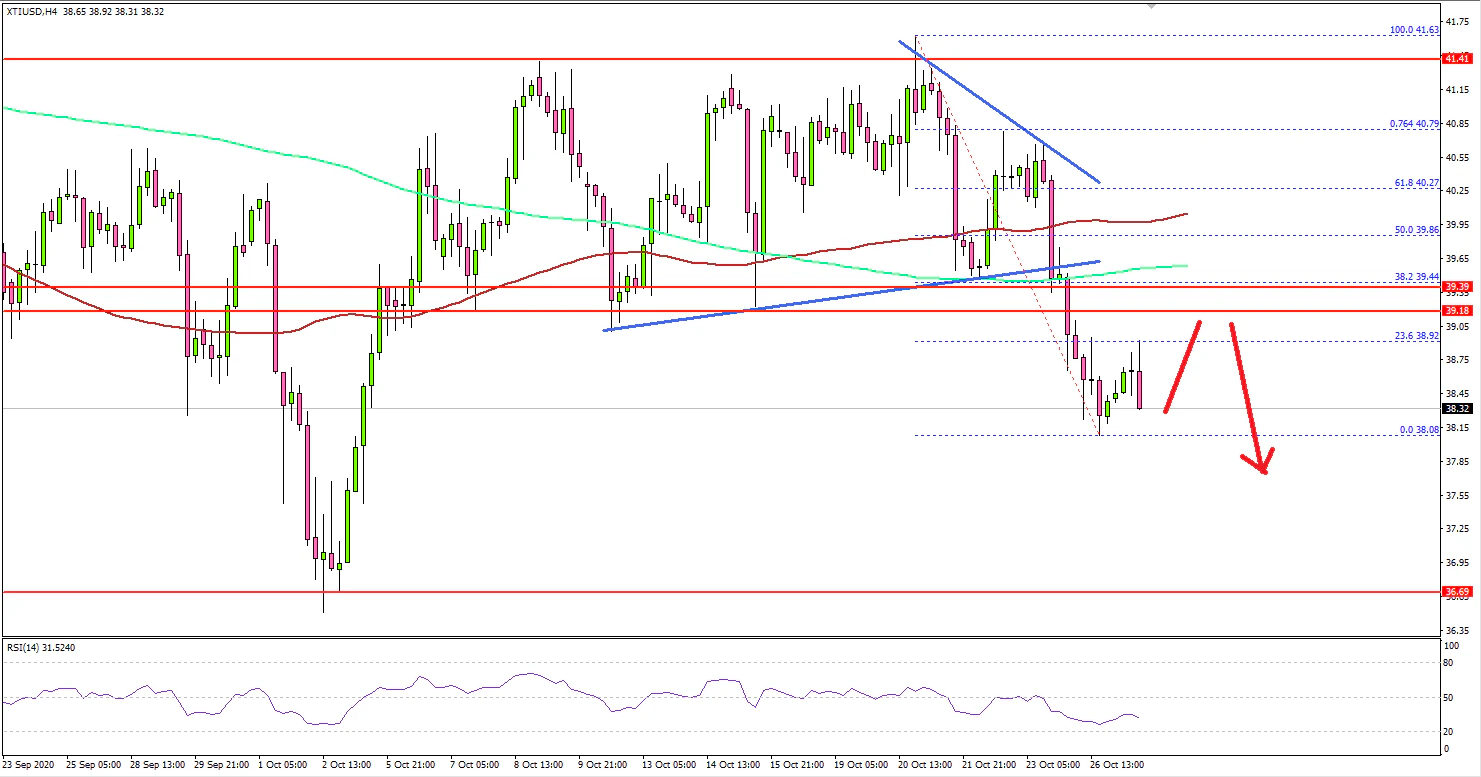 The price broke many important supports near $39.00, the 100 simple moving average (4-hours, red) and the 200 simple moving average (4-hours, green). It settled well below the $39.00 level (a crucial support and a multi-touch zone).