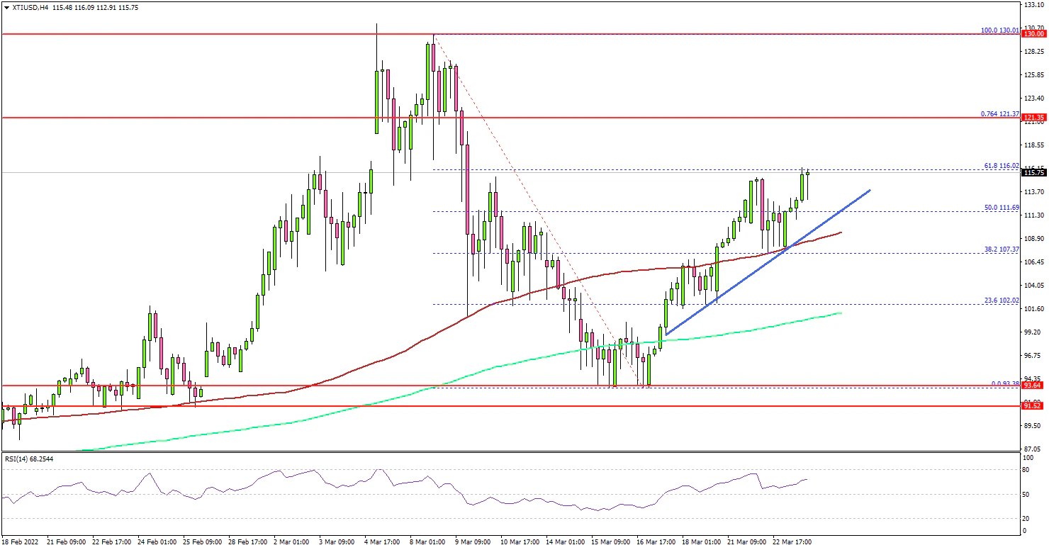 It even moved above the $110 level and the 100 simple moving average (red, 4-hours). Besides, there is a key bullish trend line forming with support near $113.70 on the same chart.