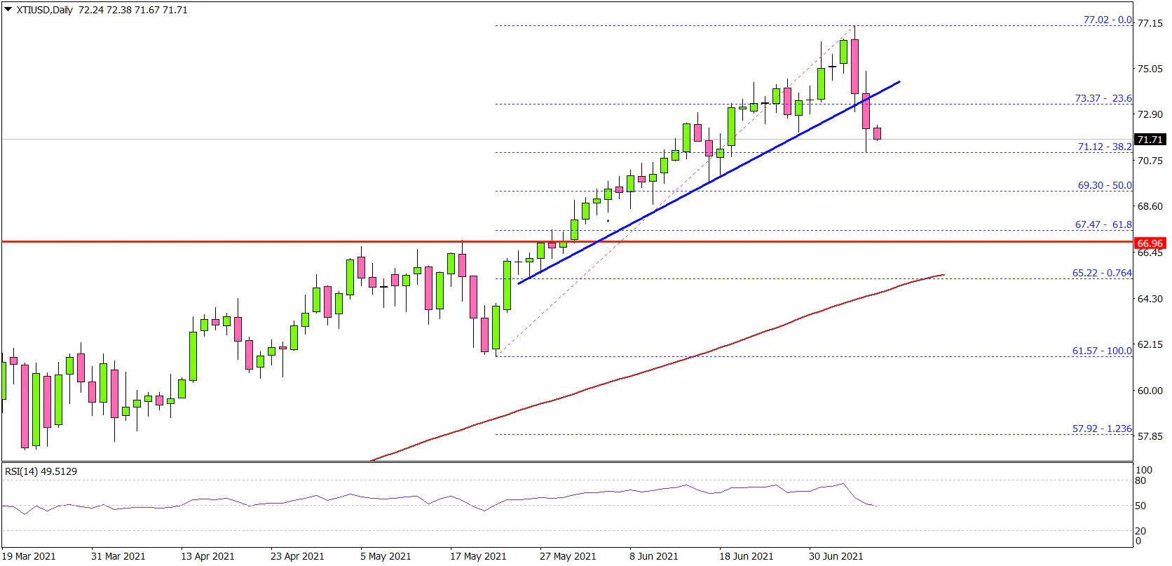 The price traded below the 23.5% Fib retracement level of the upward move from the $61.57 swing low to $77.02 high. The next major support is near the $70.00 level.