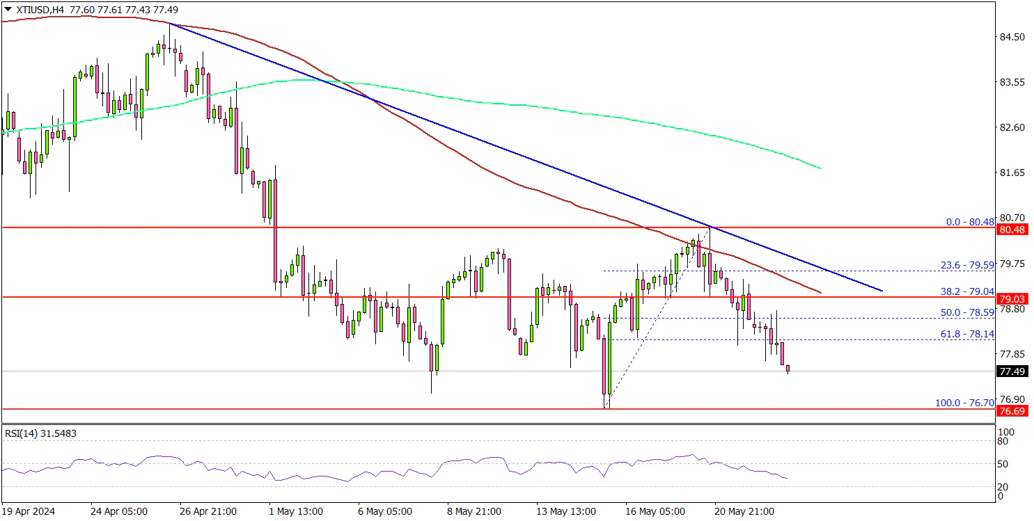 Looking at the 4-hour chart of XTI/USD, the price even settled below the 200 simple moving average (green, 4-hour) and the 100 simple moving average (red, 4-hour). Finally, the price found support near the $76.70 zone.