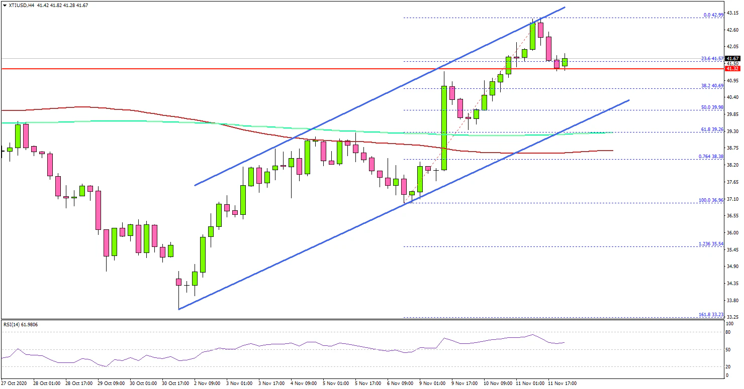 Looking at the 4-hours chart of XTI/USD, the price started a strong upward move above the $36.00 and $38.50 resistance levels. The bulls gained pace, and the price climbed above the $40.00 resistance level.