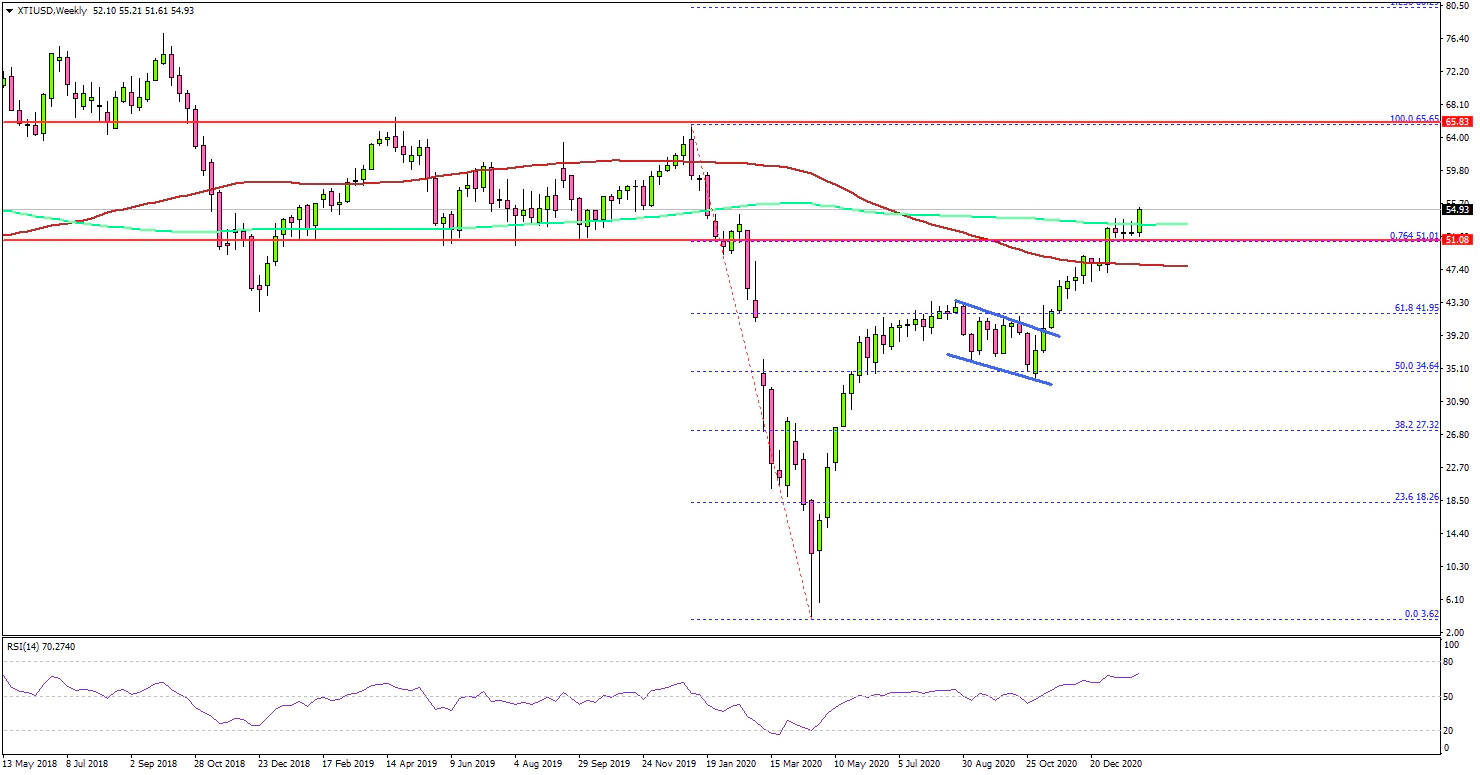 Looking at the weekly chart of XTI/USD, the price remains in a strong uptrend above the $50.00 level and the 100-week simple moving average (red). Recently, the price broke a major hurdle near the $51.00 and settled above it.