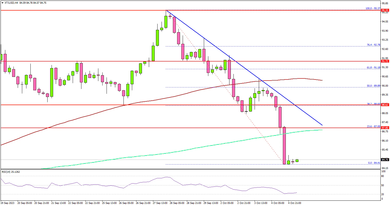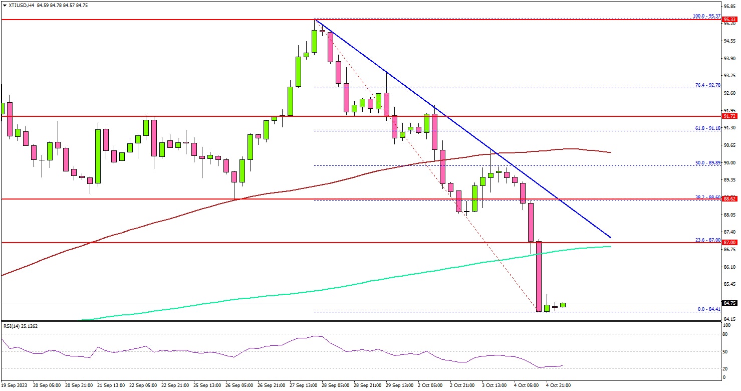 Looking at the 4-hour chart of XTI/USD, the price accelerated lower below the $90 level and the 100 simple moving average (red, 4-hour). It even traded below the 200 simple moving average (green, 4-hour).