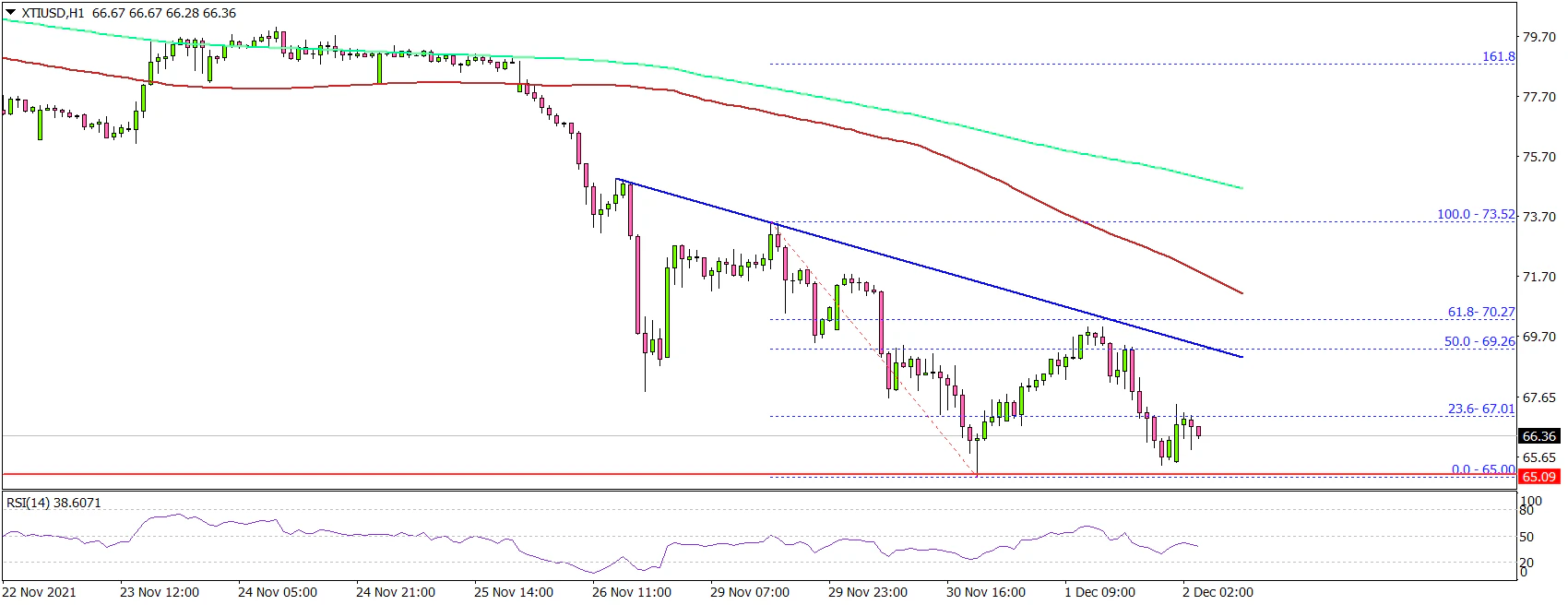 Looking at the 4-hours chart of XTI/USD, the price traded below the $72.00 support, the 100 simple moving average (4-hours, red) and the 200 simple moving average (4-hours, green).