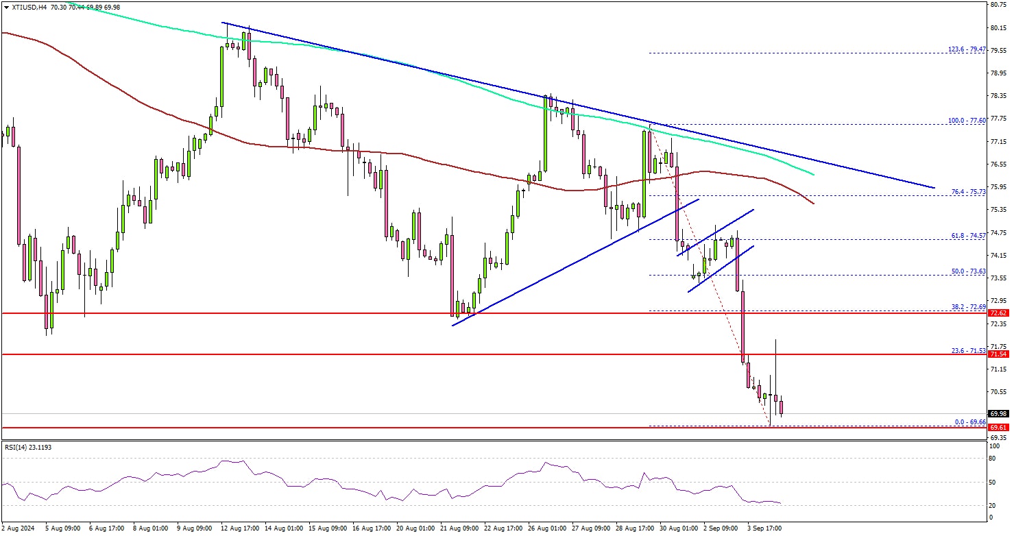Looking at the 4-hour chart of XTI/USD, the price declined below the $72.50 support, the 100 simple moving average (red, 4-hour), and the 200 simple moving average (green, 4-hour). It even spiked below the $70.00 support.