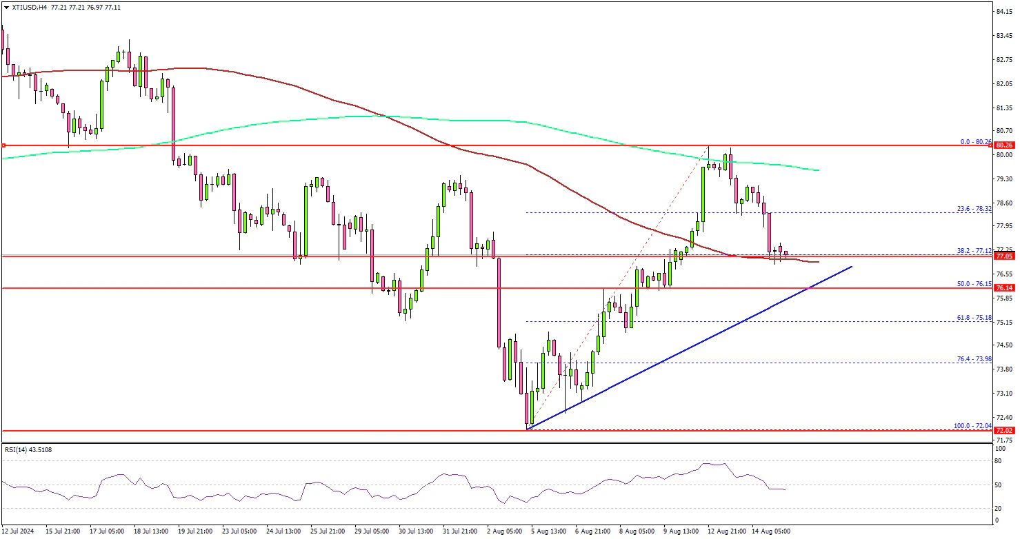Looking at the 4-hour chart of XTI/USD, the price started a fresh decline from the 80.26 level. It traded below the $78.80 and $78.00 levels. There was a test of the 38.2% Fib retracement level of the upward move from the $72.04 swing low to the $78.26 high.
