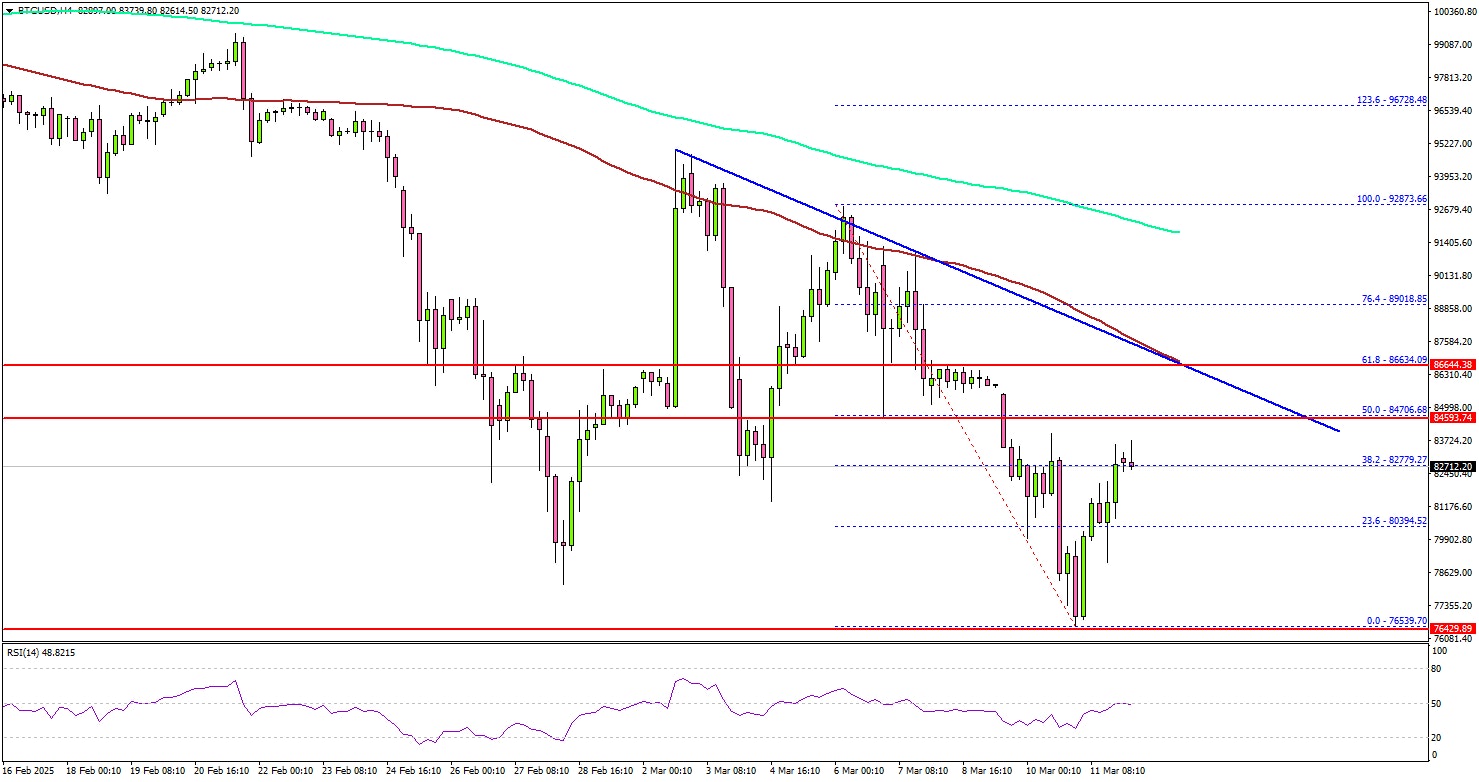 The bears even pushed the price below the $80,000 mark. A low was formed at $76,539 and the price is now consolidating losses. On the upside, the price could face resistance near the $84,700 level or the 50% Fib retracement level of the downward move from the $92,873 swing high to the $76,539 low.