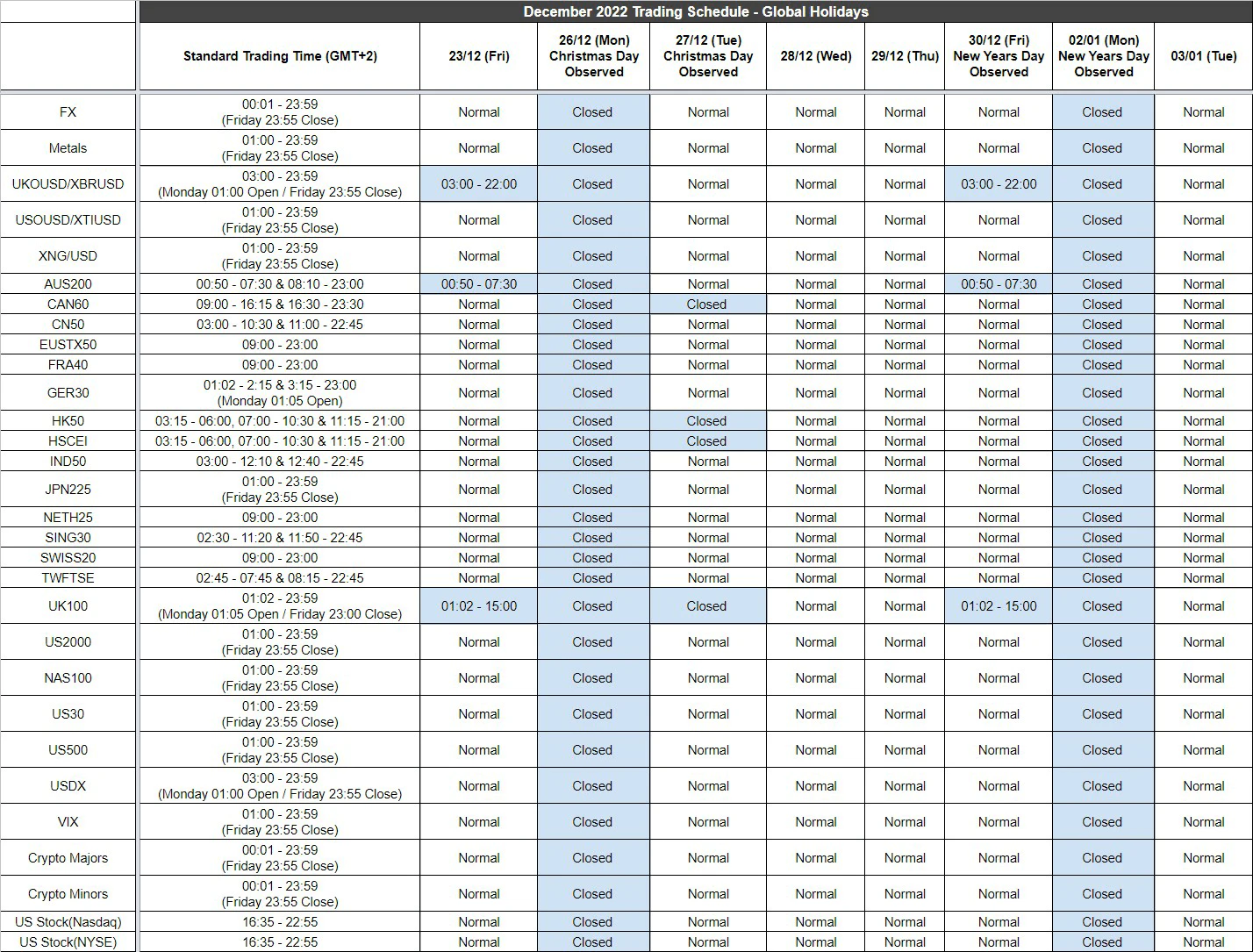 Unless indicated above the markets will be open as usual. Times shown are in the new GMT+2 server time.