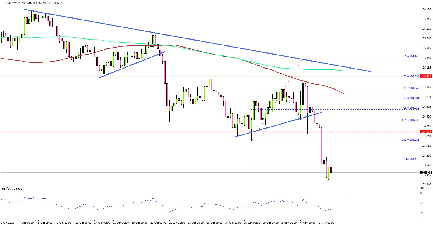 The US Dollar started a strong decline after it failed to clear the 105.40 resistance against the Japanese Yen. USD/JPY broke many supports near 104.50 and 104.20 to move into a bearish zone.