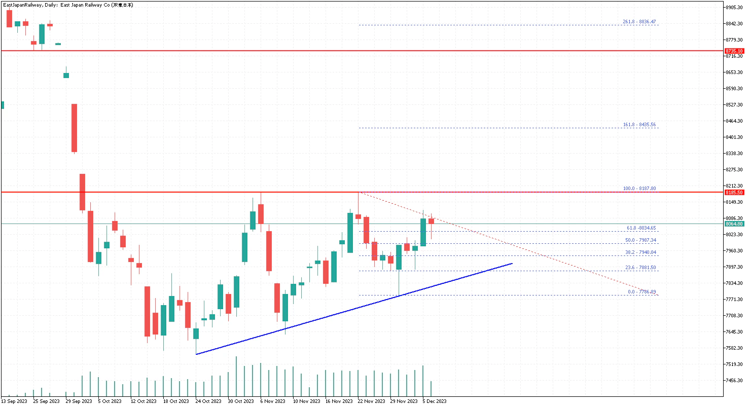 • East Japan Railways stock price is moving higher from the ¥7,785 support.