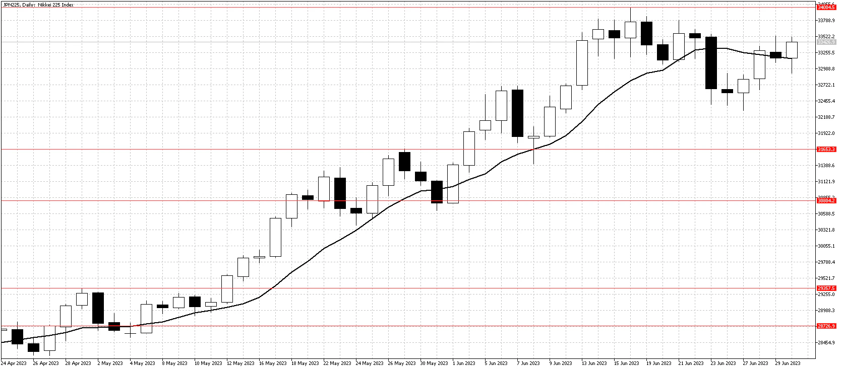While the Nikkei index stays below the recent historical high at 34,000, short and medium-term traders are better off looking to range trade and expect lower values. While higher values look possible in the longer term, the upward momentum seems to have stopped for now.