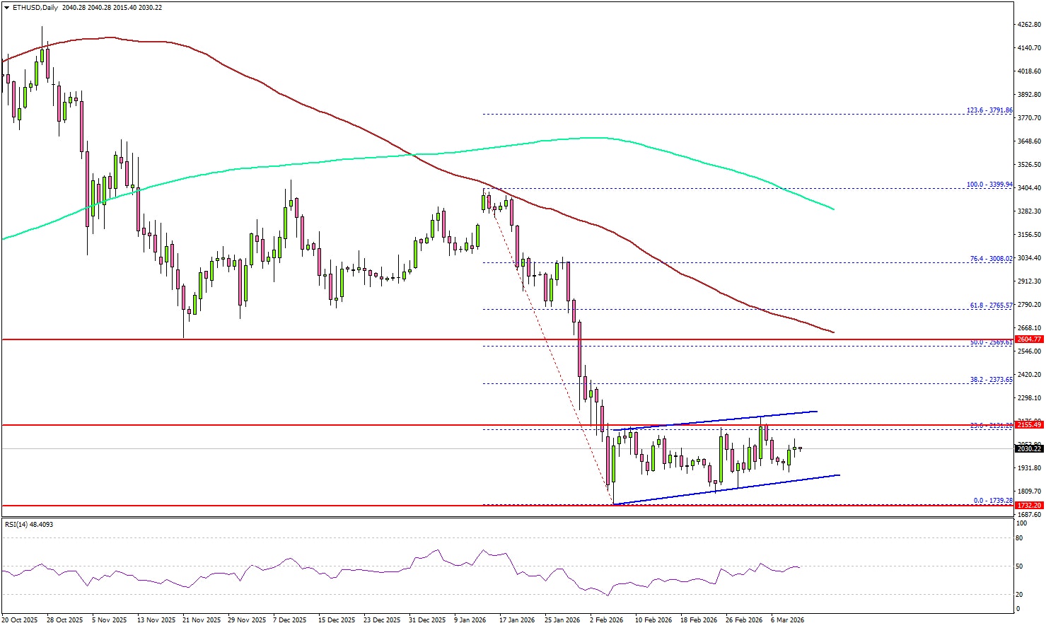 Looking at the daily chart, the price again failed to clear the 23.6% Fib retracement level of the downward move from the $3,400 swing high to the $1,740 low. There is also a rising channel forming with support at $1,865.