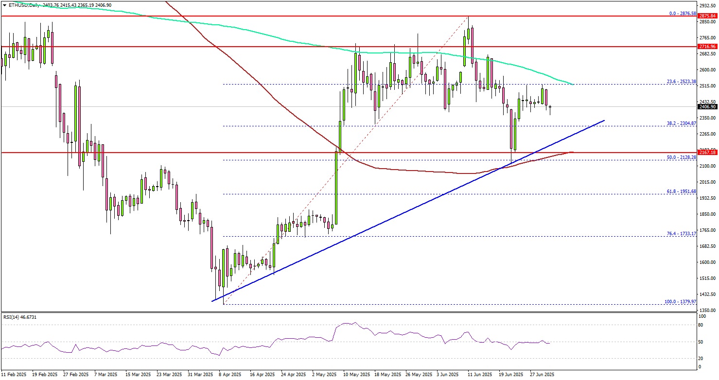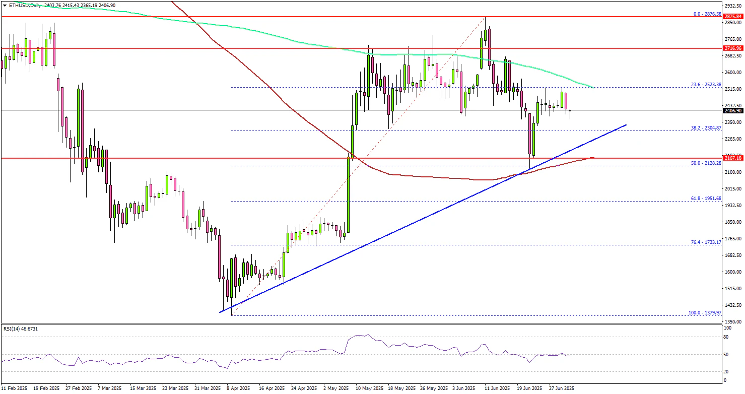 Besides, ETH is above a key bullish trend line with support at $2,300 on the same chart. On the upside, the price is facing hurdles near the 200-day simple moving average (green) and $2,550.