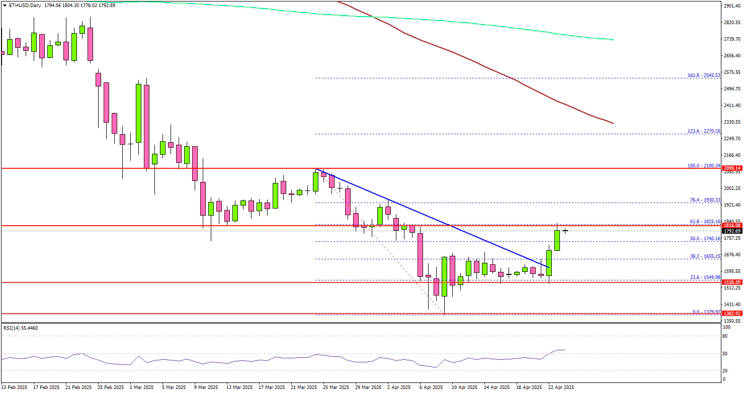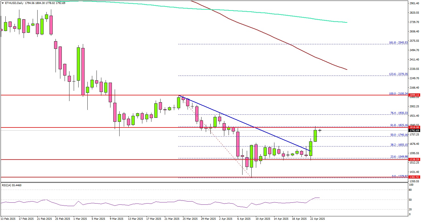 ETH settled above the 100-day simple moving average (red) and the 200-day simple moving average (green). Immediate resistance is near the $1,825 level.