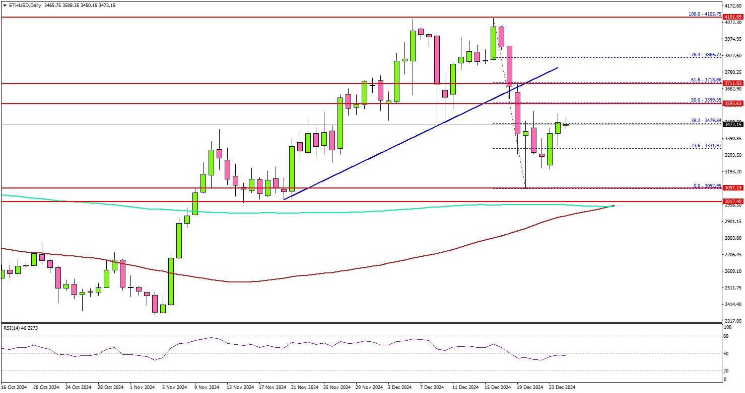 Ethereum declined heavily from $4,100 like Bitcoin. ETH traded below the $3,500 and $3,350 support levels before the bulls appeared near $3,100.