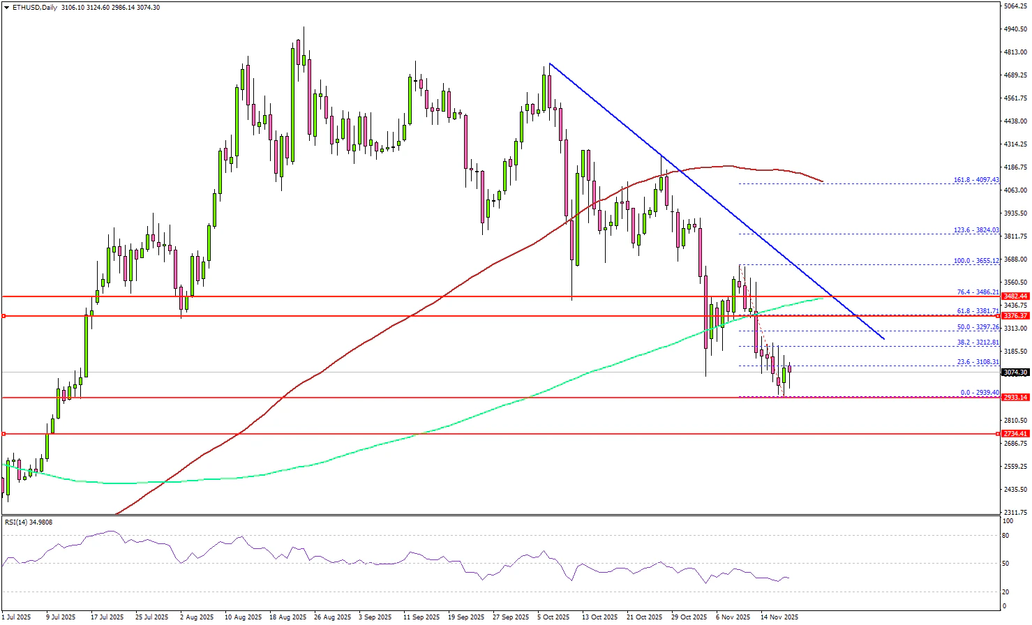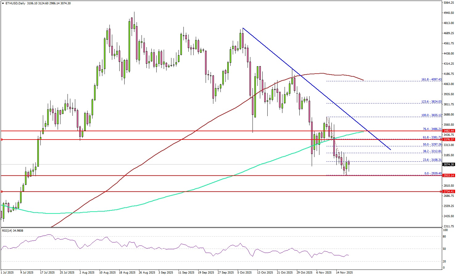 Looking at the daily chart, the price even spiked below $3,000 and settled below the 100-day simple moving average (red). The current price action suggests an increase in bearish pressure. If there is a recovery wave, the price could face resistance at $3,200.