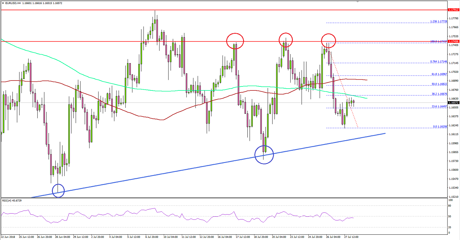 • There is a major bullish trend line in place with support at 1.1620 on the 4-hours chart of EUR/USD.