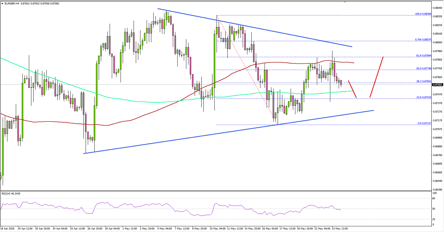The Euro found support around the 0.8700 level against the British Pound and recovered. The EUR/GBP pair is currently placed nicely above 0.8740 and is preparing for the next move.EURGBP Technical Analysis Euro British PoundLooking at the 4-hours chart, the pair bounced from the 0.8712 low and moved above the 38.2% Fib retracement level of the last decline from the 0.8836 high to 0.8712 low.At the moment, it seems like the pair is well supported above the 0.8740 level and is forming a crucial contracting triangle with resistance at 0.8810 on the 4-hours chart.The triangle resistance is close to the 76.4% Fib retracement level of the last decline from the 0.8836 high to 0.8712 low. Therefore, a break and close above 0.8800-0.8810 could open the doors for more gains in EUR/GBP.On the other hand, if the pair breaks down below 0.8740 and 0.8720, it may perhaps retest the 0.8680 support area. Looking at the other major pairs, EUR/USD remained in a bearish zone below 1.1800, and GBP/USD declined sharply below 1.3400.Recently in the UK, the Consumer Price Index for April 2018 was released by the National Statistics. The market was looking for a rise of 0.5% in the CPI in April 2018 compared with the previous month.However, the actual result was a bit lower as the CPI increased 0.4%. In terms of the yearly change, there was a rise of 2.1%, less than the forecast of +2.2% and also less than the last +2.3%. The report added: